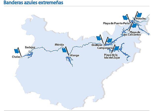 La playa Costa Dulce de Orellana la Vieja fue la primera en recibir esta distinción en 2010. A ella le siguió la playa La Dehesa de Cheles, en 2019, y ahora se suman las de Alange, Campanario, Los Calicantos (Casas de Don Pedro), Isla del Zújar (Castuera), El Espolón-Peloche (Herrera del Duque) y Talarrubias-Puerto Peña.