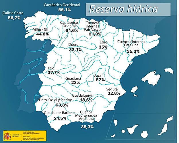 En el otro lado, la reserva hidráulica se encuentra a la mitad de su capacidad en el Miño-Sil (44,6%), Duero (33,1%), Tajo (37,3%), Guadaian 823%), Guadalete-Barbate (21,5%), Guadalquivir (18,m6%), cuenca mediterránea andaluza (35,3%), Segura (32,8%), Ebro (35%) y cuencas internas de cataluña (35,3%).