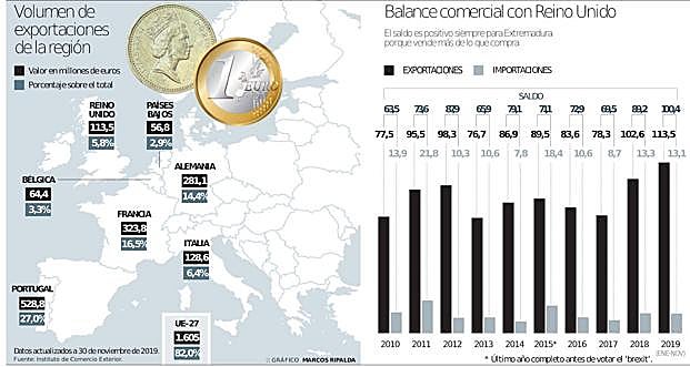 Será una pérdida en las exportaciones para la balanza comercial entre Extremadura y Reino Unido. El saldo en los diez primeros meses de 2019 fue positivo en más de cien millones de euros. Es la cuantía más alta de la última década, pero el resultado final siempre ha resultado favorable, por lo que se trata de un mercado que la región no debe permitirse perder.