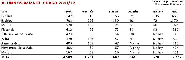 A la hora de analizar estos datos hay que tener en cuenta que no todas las sedes ofertan todos los idiomas. Italiano solo se puede estudiar en Badajoz, Cáceres, Mérida y Plasencia, y alemán en estas cuatro y también en Villanueva-Don Benito y Zafra.