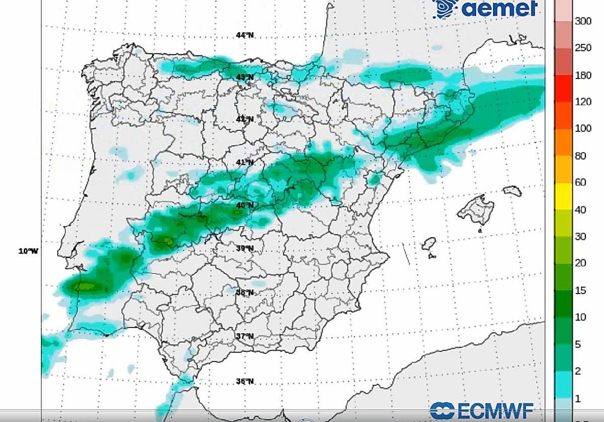 Según los modelos meteorológicos, «ahora mismo lo más probable y lo que más parece es, acumulados por debajo de los 30 generalizados en Extremadura, luego ya más localmente en el norte de Cáceres y en la zona del Tajo y Alagón, pues ya superando los 40 y ya muy localmente en la zona del norte y tal con el relance geográfico sí que podrían superarse a lo mejor puntualmente los 100 litros», avanza la meteoróloga.