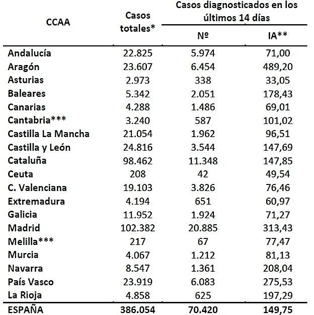 Pero la situación es más alarmante en las comunidades autónomas que marcan una mayor incidencia. En estos instantes, Aragón, región que ha focalizado en las últimas semanas la preocupación de los epidemiólogos, este dato se sitúa en los 489,20 casos por cada 100.000 habitantes, y se sitúa a la cabeza de la lista. Sin embargo, hay que tener en cuenta que el parámetro se encuentra en ligero descenso tras la adopción de medidas restrictivas por parte de su Gobierno. También superan la media española Madrid (313,43), el País Vasco (275,53), Navarra 208,04), La Rioja (197,29), Baleares (178,43) y Cataluña (147,85).