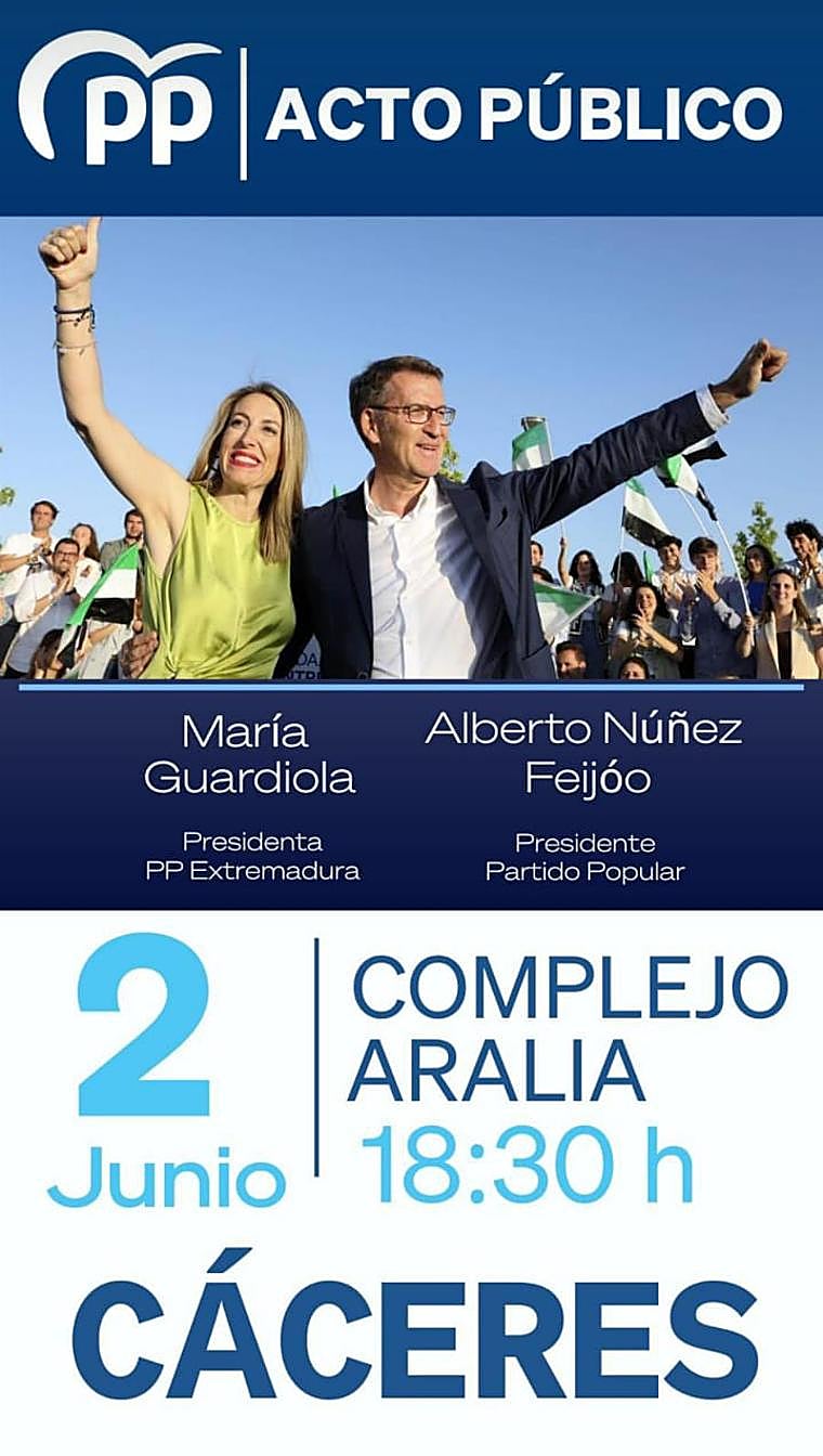 El presidente del Partido Popular, Alberto Núñez Feijóo, visitará Cáceres el próximo lunes, 2 de junio, para protagonizar un acto público junto a la presidenta de la Junta y líder de los populares en Extremadura, María Guardiola.