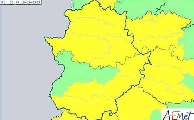 El aviso amarillo se mantiene activo desde las 6.00 horas del martes, 17 de octubre, hasta las 08.00 horas del miércoles 18 en la provincia de Cáceres donde se puede alcanzar los 40 litros por metro cuadrado en 12 horas. En la provincia de Badajoz, se activará a las 13.00 horas y terminará a las 21.00 horas, excepto en la Siberia, que finaliza a las 05.00 del miércoles. Se estima que se recojan 15 litros por metro cuadrado en una hora.