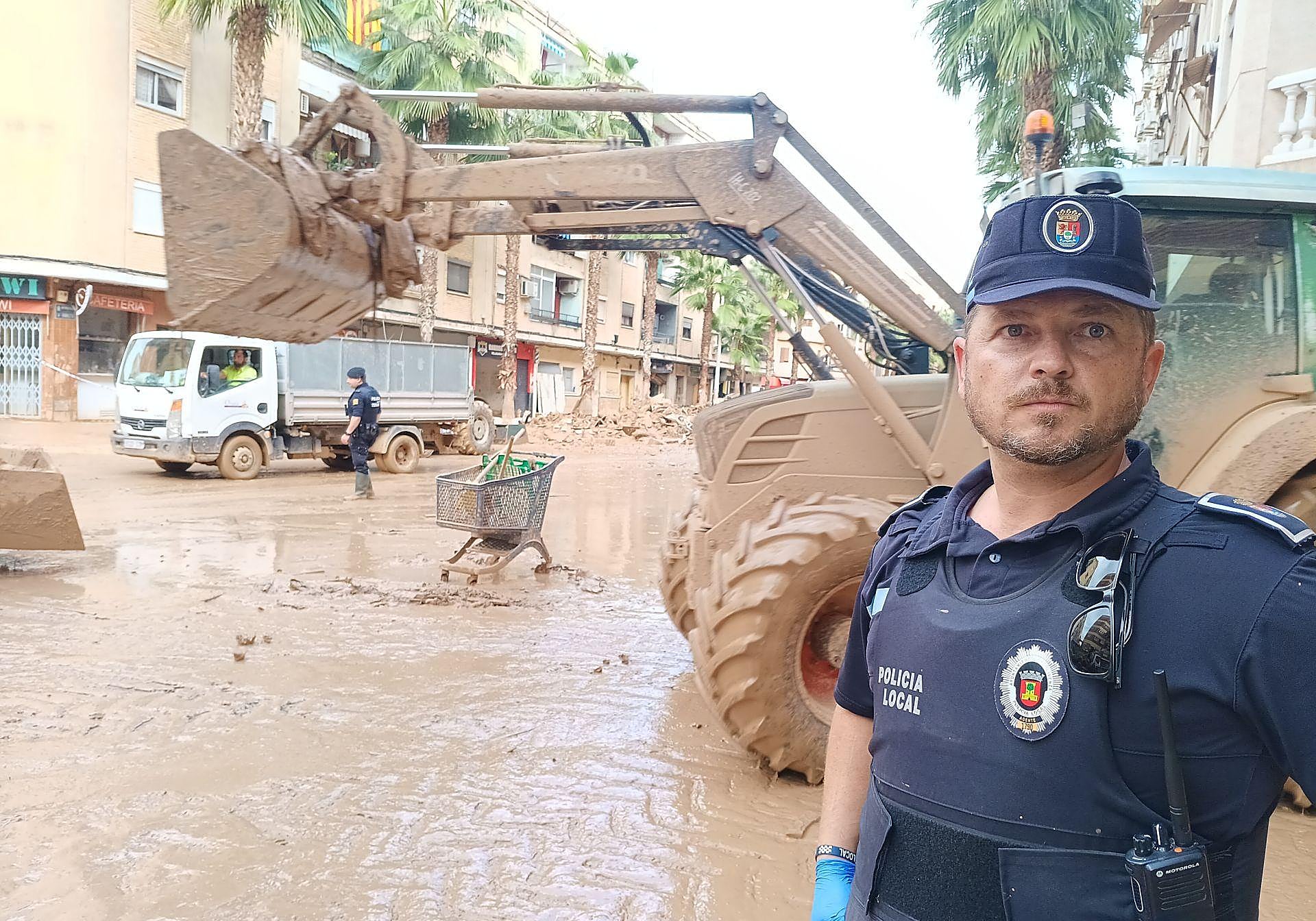 Una de las poblaciones peor paradas ha sido Catarroja, arrasada por completo. En las tareas de recuperación están participando muchos efectivos extremeños, sobre todo bomberos, pero también policías locales. Allí el ritmo de trabajo es frenético y hace falta controlar y organizar el paso de personas que se mueven entre el barro y los vehículos porque la maquinaria pesada trabaja a destajo y puede haber accidentes. De un cruce de calles en la principal avenida de Catarroja, la Rambleta, se encargaban la semana pasada dos policías locales de Olivenza: Manuel Arias y Eduard Felip Gutiérrez. «Requerían personal y voluntariamente nos presentamos. Había más compañeros deseando venir y al final se hizo un sorteo. Nos ha tocado a nosotros pero venimos en representación de toda la plantilla, ya que gracias a ellos podemos estar aquí porque nos sustituyen en el servicio ordinario», señala Arias a HOY.
