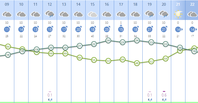 La predicción por horas de la Aemet para Badajoz señala que lloverá de manera dispersa sobre el mediodía y a últimas horas de la tarde, aunque no se descartan precipitaciones débiles a otras horas. Los romeros de Bótoa igual tienen que recoger antes de lo previsto en su vuelta a la capital pacense