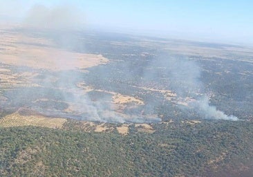 En la zona se han mantenido en las labores de extinción seis unidades de bomberos forestales, dos medios aéreos, dos agentes del medio natural y un técnico. También colaboran bomberos de la Diputación de Badajoz