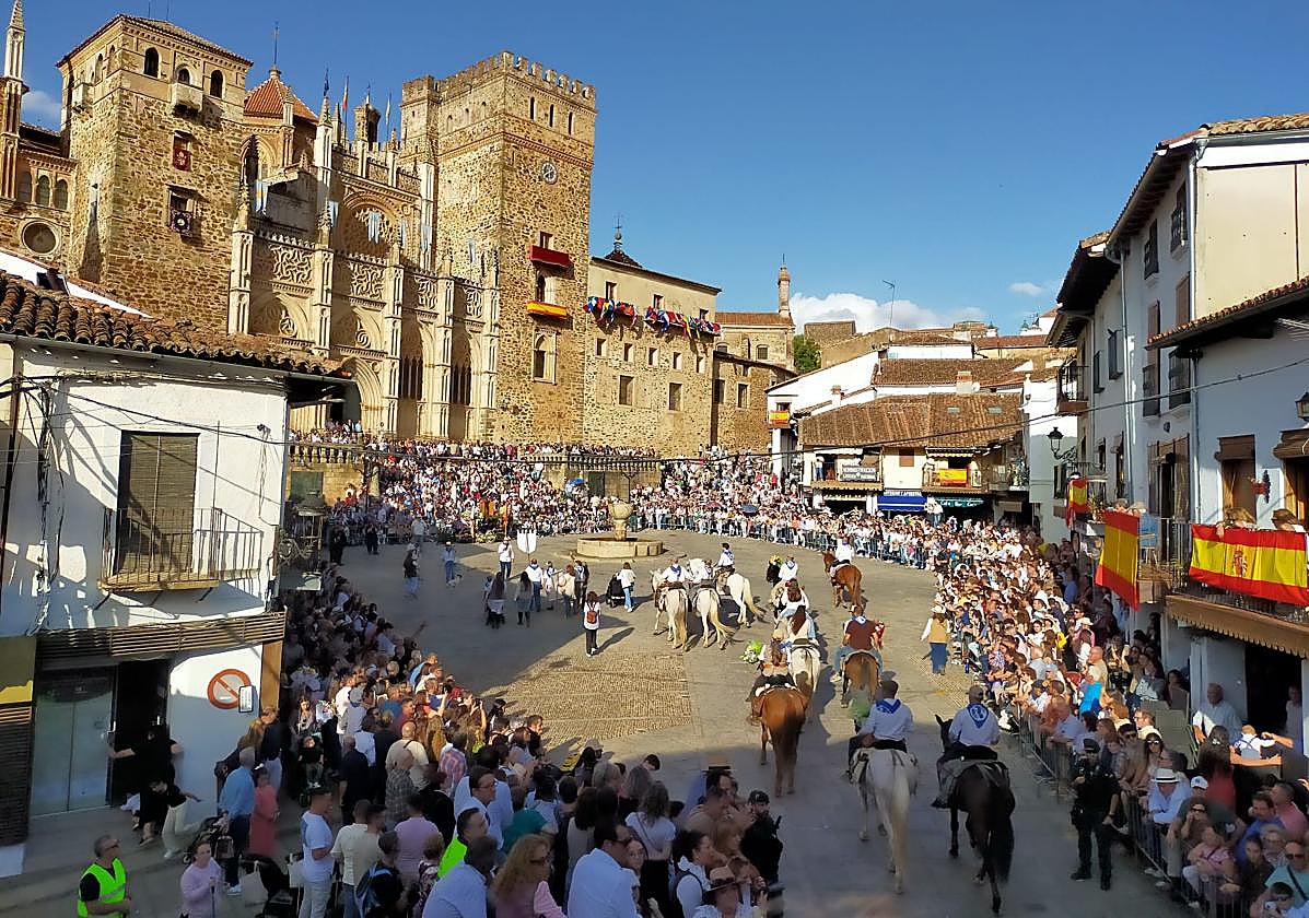 La procesión de las banderas y la recepción de los jinetes y amazonas fueron los momentos álgidos de este 12 de octubre junto al Real Monasterio de Nuestra Señora de Guadalupe