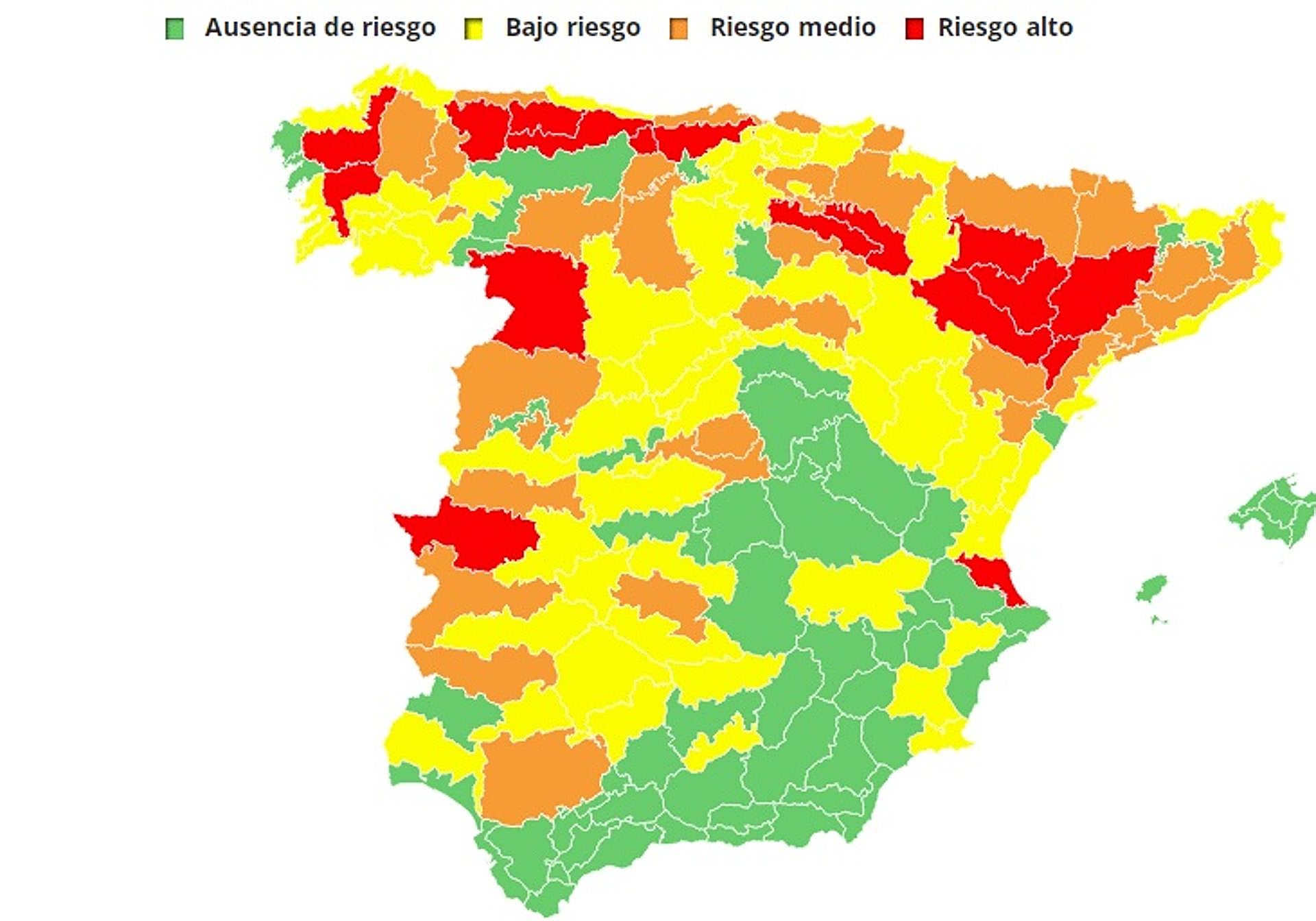 El mapa de niveles de riesgo para la salud de Meteosalud, publicado en la web del Ministerio de Sanidad, indica que están en nivel rojo los municipios de la Meseta Cacereña. El aviso de impacto para la salud por el calor extremo es de nivel naranja -riesgo medio- en el Tajo y el Alagón, las Vegas del Guadiana y todo el Sur de la provincia de Badajoz, siendo de nivel amarillo en el resto de la región.