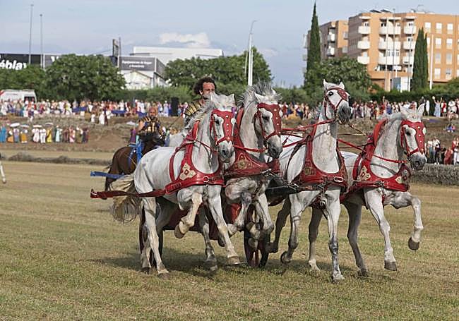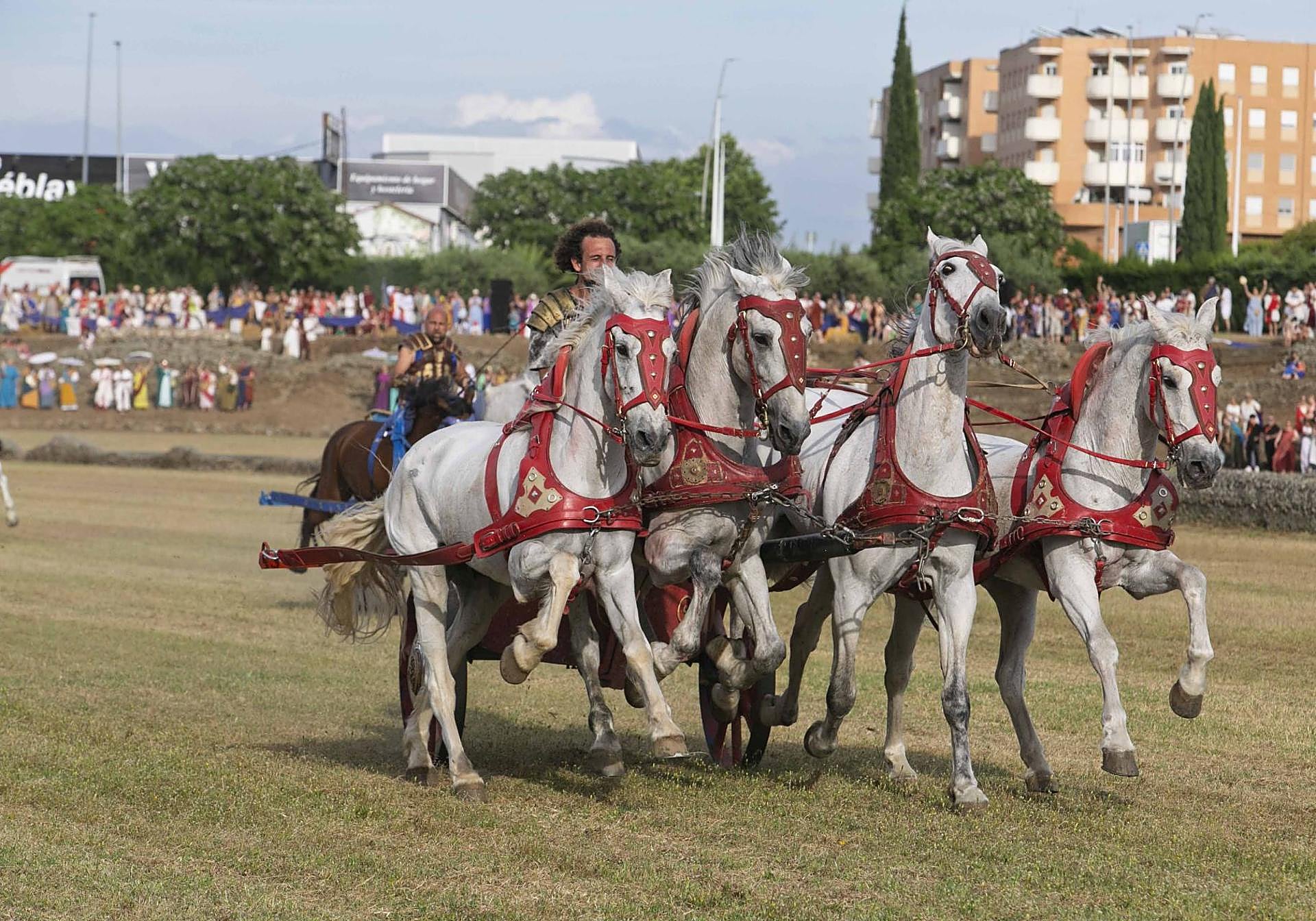 En el festivo local con motivo de la celebración de Emerita Lvdica los emeritenses han disfrutado de la espectacular recreación de una carrera de cuadrigas que se lleva a cabo por primera vez en el Circo Romano. A pesar de las grandes dimensiones del recinto, hubo lleno y se completó el aforo.