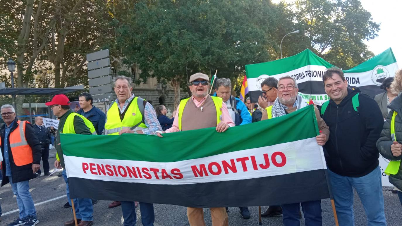 Los pensionistas extremeños han acudido con pancartas con la bandera de la región, entre ellos, un grupo de la Plataforma de Pensionistas de Montijo.