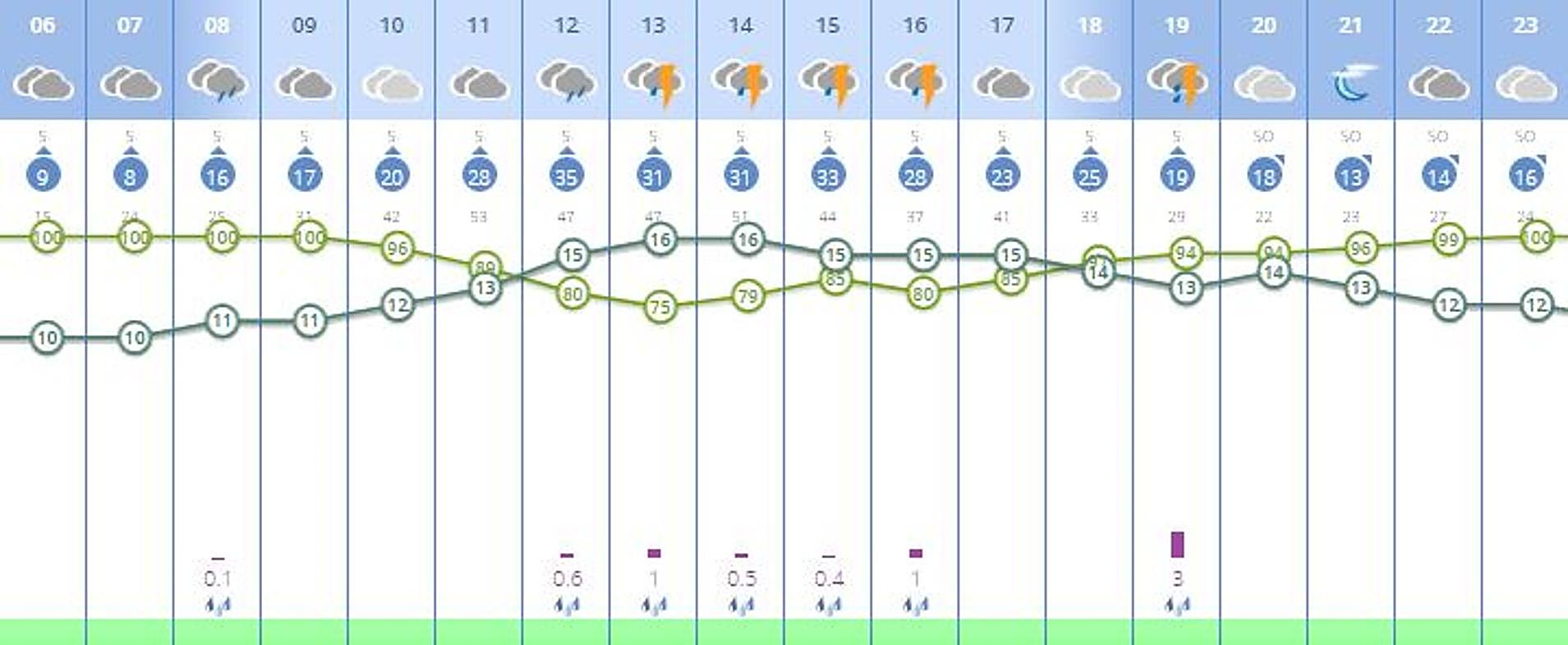Además, entre las 13.00 y las 19.00 horas la probabilidad de tormenta será del 75%, y hasta final del día bajará hasta el 70%. Las temperaturas rondarán entre los 9 grados de mínima y los 16 de máxima.