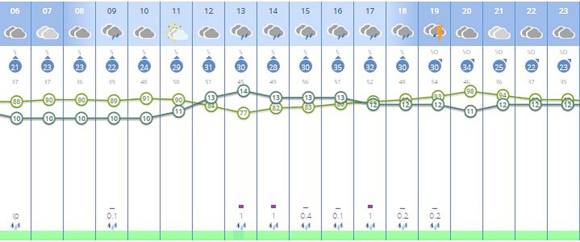 Se estiman lluvias entre las 12.00 y las 17.00 horas; cada hora acumulará entre 0,4 y 1 litro de agua por metro cuadrado. Tras dos horas donde la Aemet no espera más agua, a las 19.00 horas volverán de nuevo las lluvias, las más abundantes del día, cuando se espera que caigan 3 litros de agua por metro cuadrado en una hora.