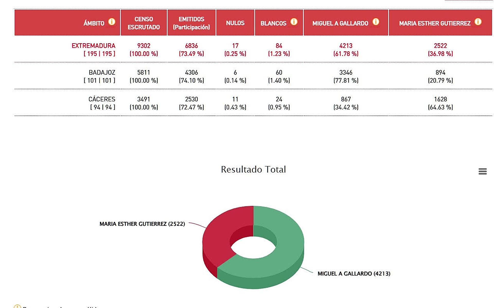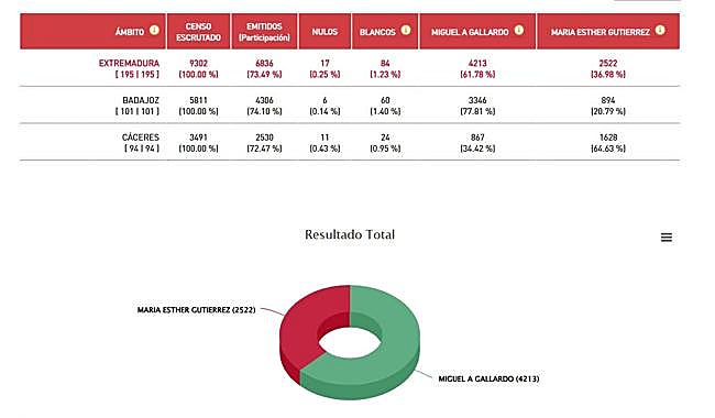 La victoria de Gallardo se ha concretado en el apoyo de algo más de 4.213 votos de los 6.836 emitidos. El porcentaje de apoyo en la provincia de Badajoz ha sido del 77,81%, mientras que en la provincia cacereña la candidatura del villanovense recibió el 34,4% de los votos.