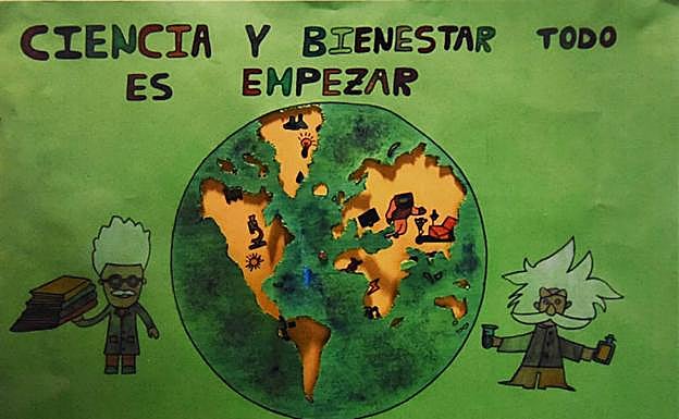 En su cartel dibujó a dos científicos junto a un planeta Tierra en el que fueron recortados sus continentes para que pudiera verse una segunda capa que, a medida que es girada, deja al descubierto a un astronauta, unas bombillas, un sol, un rayo y otros elementos relacionados con la ciencia.