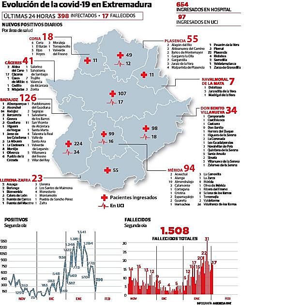 En Don Benito-Villanueva se notifican 34 positivos. Este área tiene 98 hospitalizados y del total, 18 en la UCI.