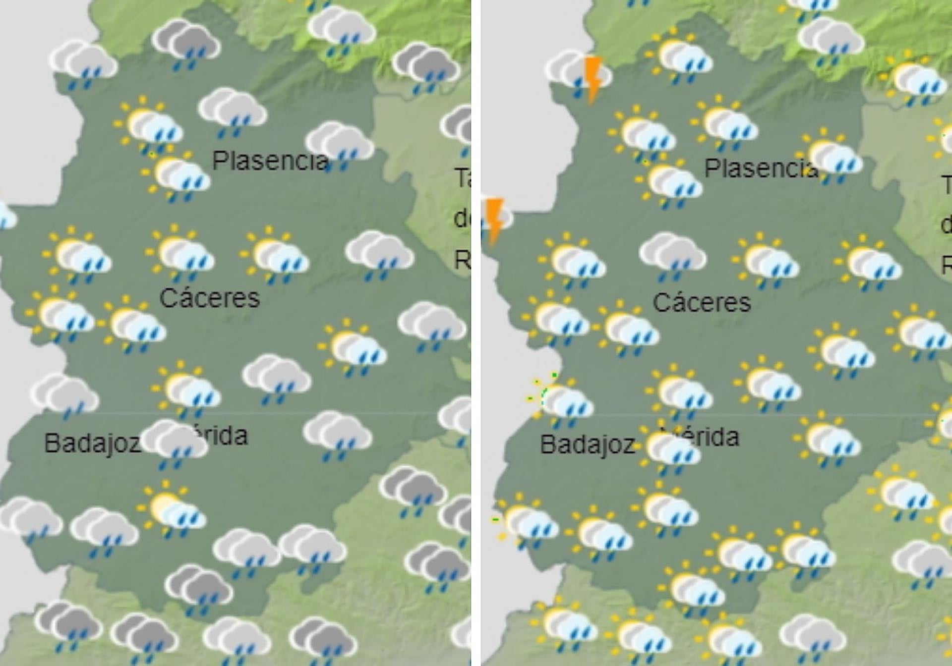Para el jueves se esperán más lluvias, aunque en este caso se tratarían de chubascos más débiles. La novedad estará en los termómetras, ya que se espera una caída de las temperaturas, que no superarán los 20 grados de máxima en la provincia cacereña -el mercurio oscilará entre los 12 y 19 grados- y lo hará ligeramente en la provincia de Badajoz -los datos se quedarán entre los 12 y 21 grados-.