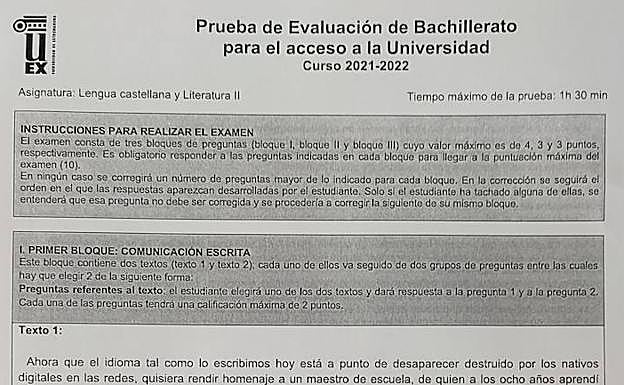 Llamada por nombre y apellidos, carné de identidad en la puerta e instrucciones amables pero firmes y repitiéndose para cada tanda de alumnos que iba ... pasando al aula. Mochilas en una esquina de la sala, todos los móviles apagados, se permite botella de agua y se recuerda que no hace falta calculadora porque el examen -el primero de la EBAU (Evaluación del Bachillerato para el Acceso a la Universidad)- es de Lengua y Literatura. Esto ocurría esta mañana a las nueve en la Facultad de Económicas de la Universidad de Extremadura. Apenas unos minutos antes, los estudiantes se arremolinaban en grupos y la tensión se podía palpar entre murmullos de cientos de jóvenes nacidos en su mayoría en 2004.