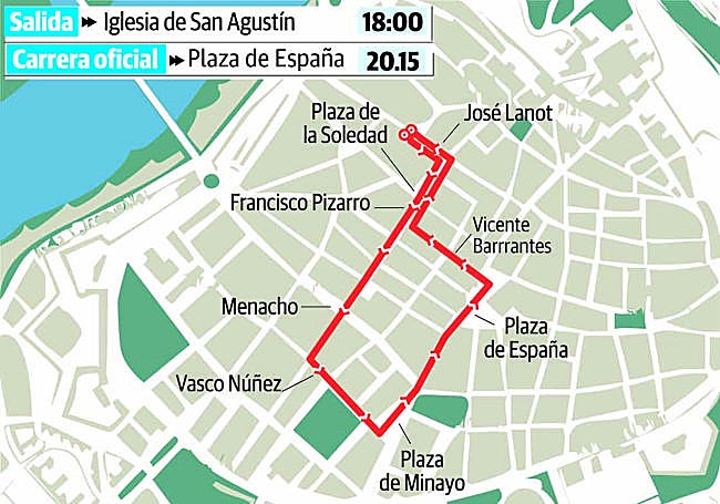 Procesión de la Pontificia y Real Hermandad y Cofradía de Nuestro Señor Jesucristo Yacente (Santo Entierro), Nuestra Señora de las Lágrimas y Santiago Apóstol Procesión Oficial de la Ciudad: Salida a las 18.00 horas de la Plaza de San Agustín, C/ José Lanot, Plaza de la Soledad, C/ Francisco Pizarro, C/ Vasco Núñez, Plaza de Minayo, C/ Obispo San Juan de Ribera, Plaza de España (Carrera Oficial - Estación de Penitencia en la S.I. Catedral Metropolitana), C/ Vicente Barrantes, C/ Francisco Pizarro, Plaza de la Soledad, C/ José Lanot y entrada a la Plaza de San Agustín (sin hora).