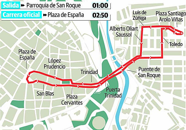 Procesión de la Cofradía de la Entrada Triunfal de Cristo en Jerusalén Santísimo Cristo de la Paz y Nuestra Señora de la Palma: Salida a las 1.00 horas de la Parroquia de San Roque, Plaza Santiago Arolo, C/ Porvenir, C/ Alberto Oliart Saussol, Av. Ricardo Carapeto, Puente del Revellín, Jardines de la Legión (por su interior), Plaza 18 de Diciembre, C/ Trinidad, Plaza de Cervantes, C/ López Prudencio Plaza de España (Carrera Oficial - Estación de Penitencia en la S.I. Catedral Metropolitana), C/ San Blas, Plaza de Cervantes (Presentación a la Hdad. de San Andrés), C/ Trinidad, Plaza 18 de Diciembre, Jardines de la Legión, Puente de San Roque, Av. Ricardo Carapeto, C/ Toledo, Plaza Santiago Arolo y entrada a la Parroquia de San Roque en Carrera Oficial - Cruz de Guía a las 2.50 horas.