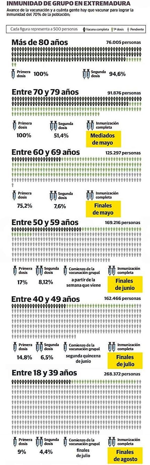 Extremadura ha administrado 499.070 dosis, según los últimos datos del SES. Corresponden a la jornada del jueves y todo apunta a que este fin de semana se superará el medio millón de vacunas puestas en esta comunidad.