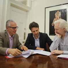 El canciller ecuatoriano, Guillaume Long (c), junto al fundador de WikiLeaks, Julian Assange (d), y su abogado, Baltasar Garzón.