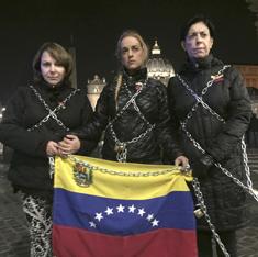 "El Vaticano es parte de un diálogo que ha empezado en Venezuela y ese diálogo no ha dado resultados", criticó Tintori, encadenada a una verja frente al Vaticano y con una bandera venezolana, una foto de su marido, de Ledezma y de todos los políticos presos a sus pies.
