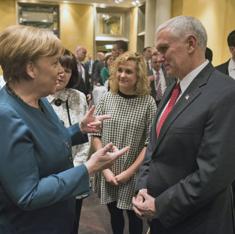 El vicepresidente Mike Pence, charla con Angela Merkel en la Conferencia de Seguridad de Múnich.