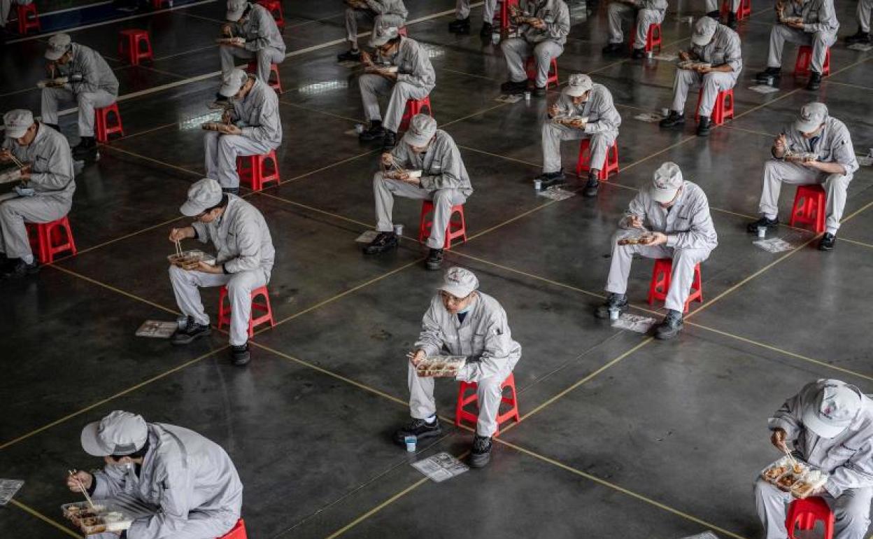 Trabajadores de la planta de Honda de Wuhan durante el descanso para comer. Afp