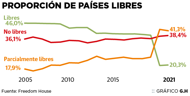 Amy Slipowitz, de la ONG proderechos humanos señala que la principal razón del declive democrático en el mundo se encuentra en que los líderes autoritarios colaboran entre sí. Y en esa colaboración hay un régimen preeminente: China. «Vive una deriva autoritaria que sufren tanto sus ciudadanos como el resto del mundo. Porque toma represalias contra países o empresas que critican sus desmanes con los uigures o con Hong Kong. Además, colabora con otras dictaduras independientemente de su ideología», explica. Como los militares golpistas en Tailandia y Myanmar, el régimen Talibán, Venezuela o los países más corruptos de África.