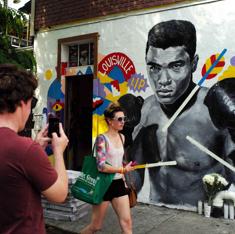 Flores ante un mural de Mohamed Ali en Nueva York.