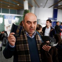 El pasajero Fuad Sharef Suleman muestra su pasaporte después de tener que volver a Iraq desde Egipto.