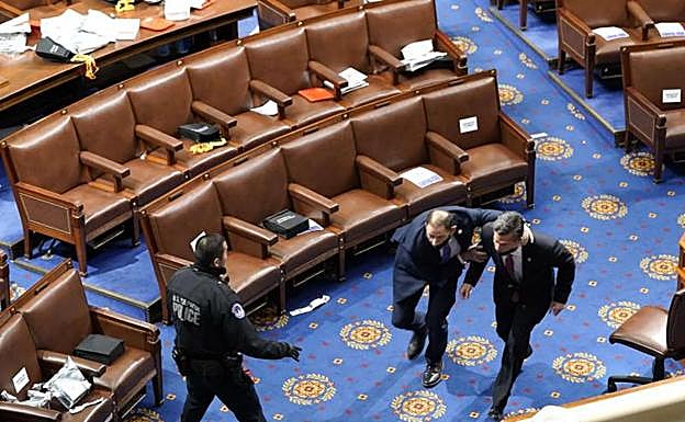 Las mismas imágenes volvieron ayer a la mente de los norteamericanos al contemplar el asalto al Capitolio. La última vez que este edificio resultó atacado fue en 1814 por las tropas británicas. Entonces fue pasto de las llamas y anoche, del vandalismo. El interior del hemiciclo ha quedado «destrozado», y algunas fuentes aseguraban que sería imposible reiniciar la sesión de confirmación de Biden en los próximos días. Sin embargo, Nancy Pelosi anunció que la votación se reanudaría a lo largo de la madrugada y así fue. La sesión se retomó con un discurso en el que Mike Pence condenó el «vandalismo» de los asaltantes.