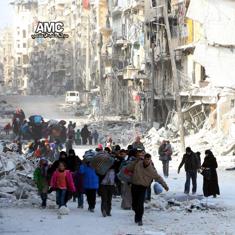 Un grupo de familias sirias abandona los barrios del este de Alepo.