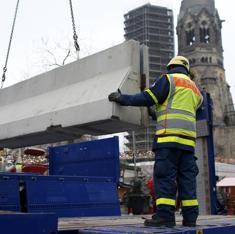 Trabajadores colocan barreras alrededor de un mercadillo navideño en la plaza Breitscheid de Berlín.