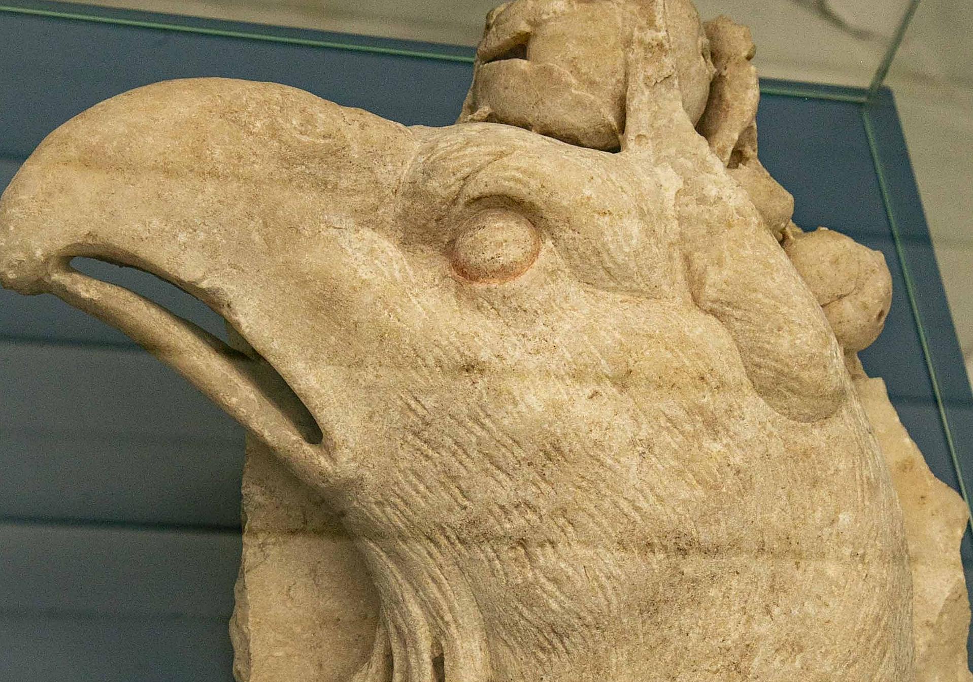Se encuentra, por ejemplo, la esfinge esculpida en un bloque monolítico de mármol blanco con alas que vigilaba la cavea del Teatro Romano. Le falta la cabeza, el remate de las alas y las patas delanteras, pero conserva mechones de cabello ondulado, restos de plumaje y casi todas las alas. También las seis mamas del vientre. Los romanos, explica Ayerbe, crearon un lenguaje simbólico en el que la mitología estaba al servicio de la propaganda. La esfinge tiene cuerpo de leona y le falta la cabeza de una mujer. Es una imagen mitológica de Egipto que absorben los griegos y luego los romanos lo integran en su lenguaje. En el mundo clásico simbolizaba el poder, la fuerza y el triunfo de la vida.