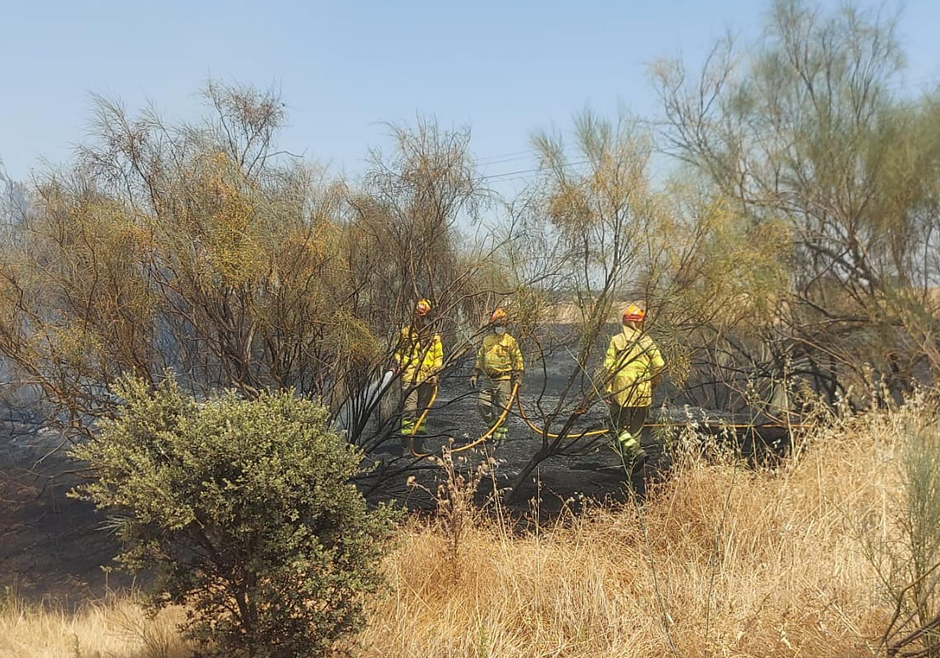 Bomberos forestales del Plan Infoex también han trabajado este lunes en otro incendio de pastos declarado junto a la N-630, entre las localidades cacereñas de Aldea del Cano y Casas de Don Antonio.