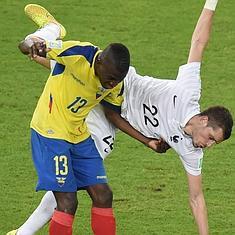 Se habían producido algunos brotes de violencia en el primer acto, sobre todo un codazo del central francés Sakho a Minda en un saque de esquina y un brazo suelto que le dejó Antonio Valencia a Pogba. La tercera brusquedad, una peligrosa plancha del jugador del Manchester United a Digne, fue sancionada con roja directa por el árbitro marfileño. Enorme hándicap para Ecuador con casi toda la segunda parte por delante y obligado a buscar el gol.