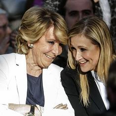 La presidenta del PP de Madrid y candidata a la Alcaldía de Madrid, Esperanza Aguirre, y la candidata a la Comunidad de Madrid, Cristina Cifuentes, han invitado este martes a los activistas antidesahucios que las han increpado en su visita a Villaverde a tomar la palabra en el mitin que se ha celebrado en una plaza del distrito.