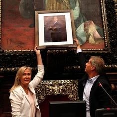 Fernández ha llegado a la sala de plenos del consistorio rodeado de periodistas con un cuadro de Felipe VI, que ha situado sobre una silla en el lugar donde se encontraba el busto del exjefe del Estado, Juan Carlos I.
