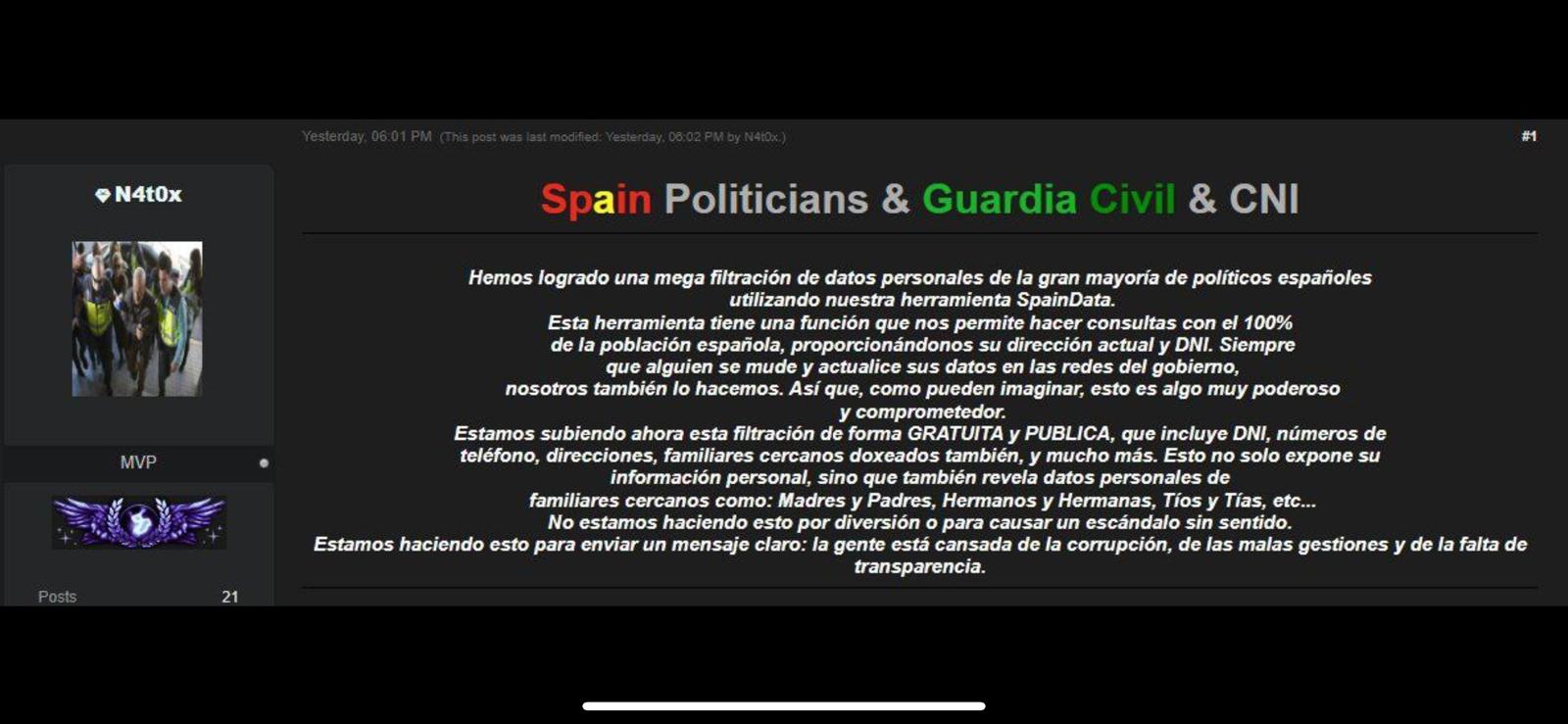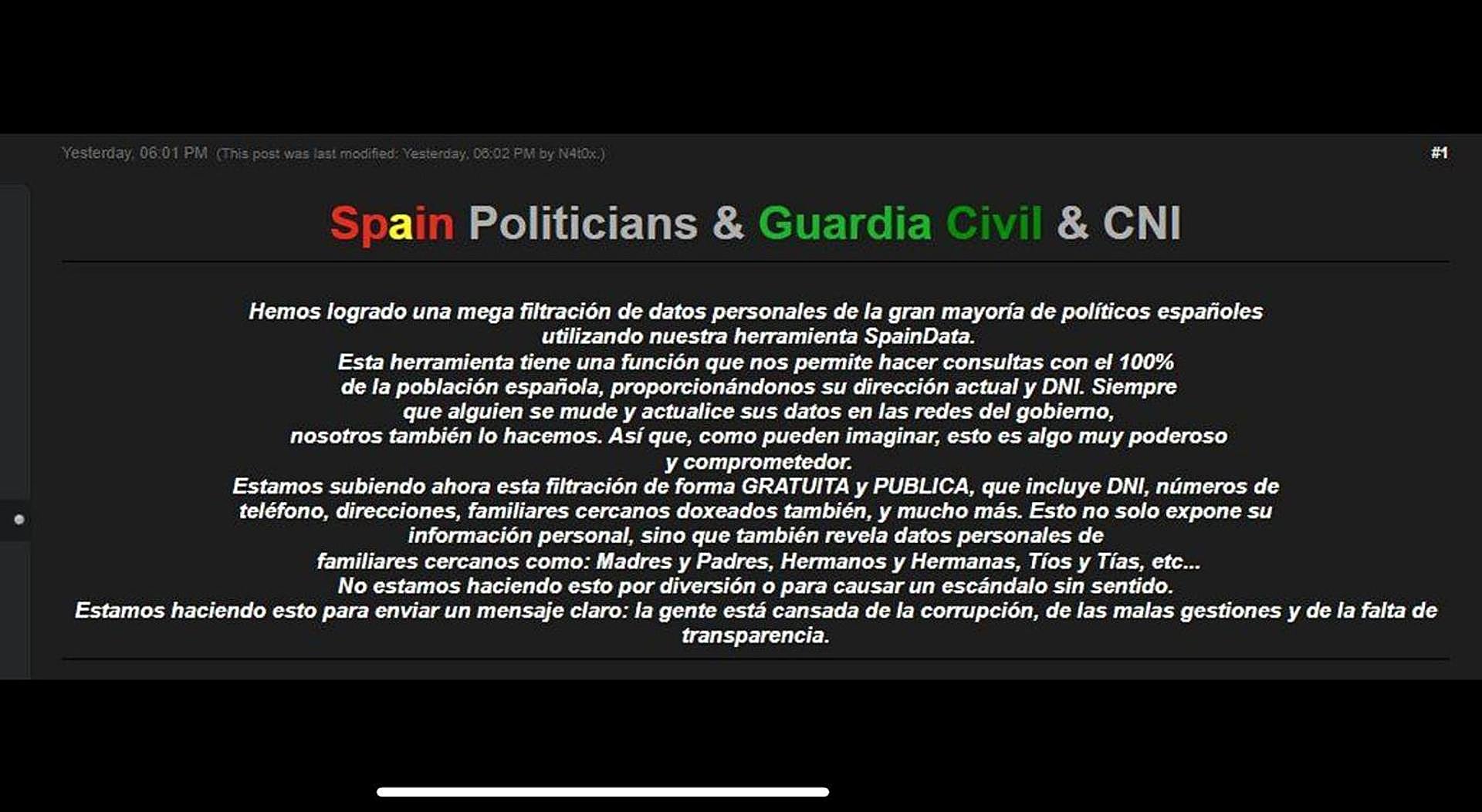 El titular del juzgado central número 6 de la Audiencia Nacional, Antonio Piña, ha abierto una investigación 'secreta' sobre una nueva filtración de datos «sensibles» ... y personales de Pedro Sánchez y su entorno familiar (tales como DNI y direcciones domiciliarias), que han sido publicados en foros de la denominada dark web y en un canal de Telegram del presunto hacker N4T0X, quien ha reivindicado esta acción.