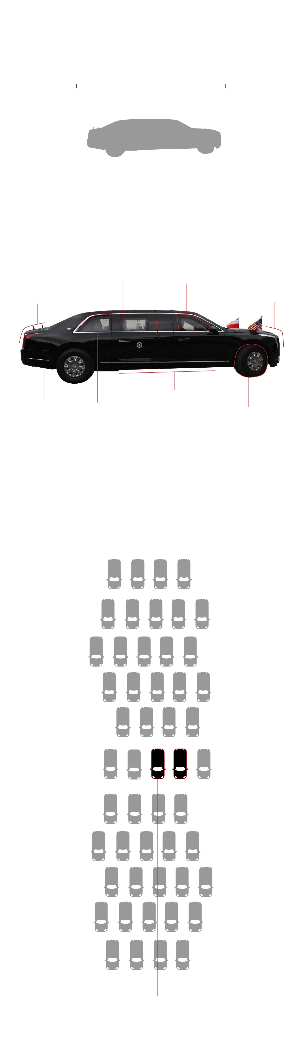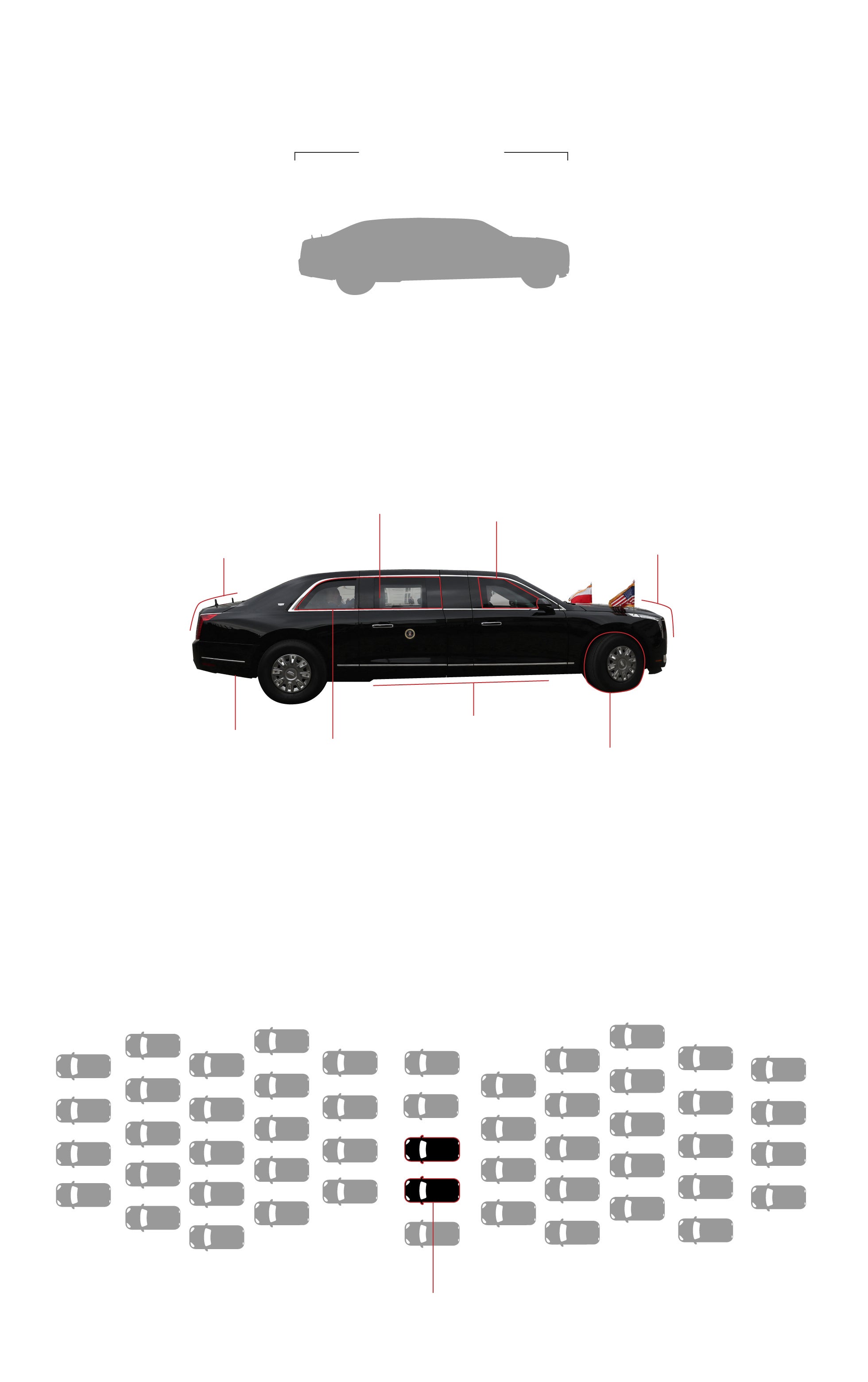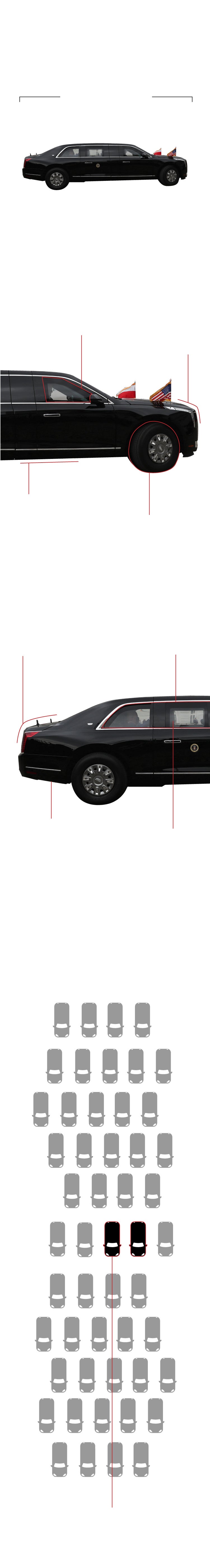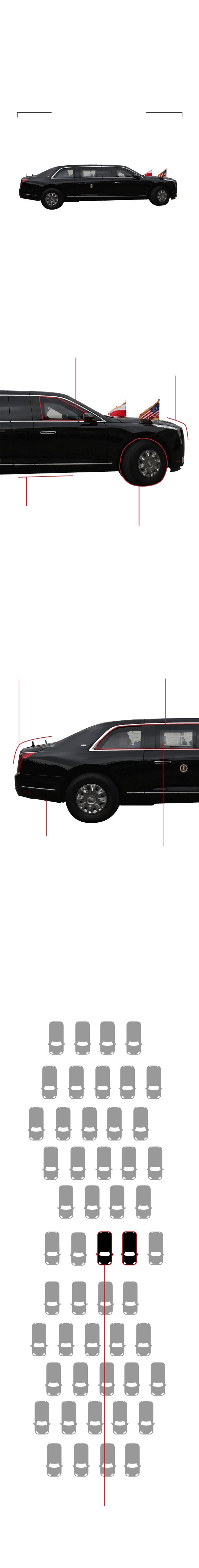 La limusina está blindada para proteger al presidente de cualquier tipo de ataque, incluso contra uno con armamento químico. El interior está sellado y sus puertas tienen un grosor de 20 centímetros.