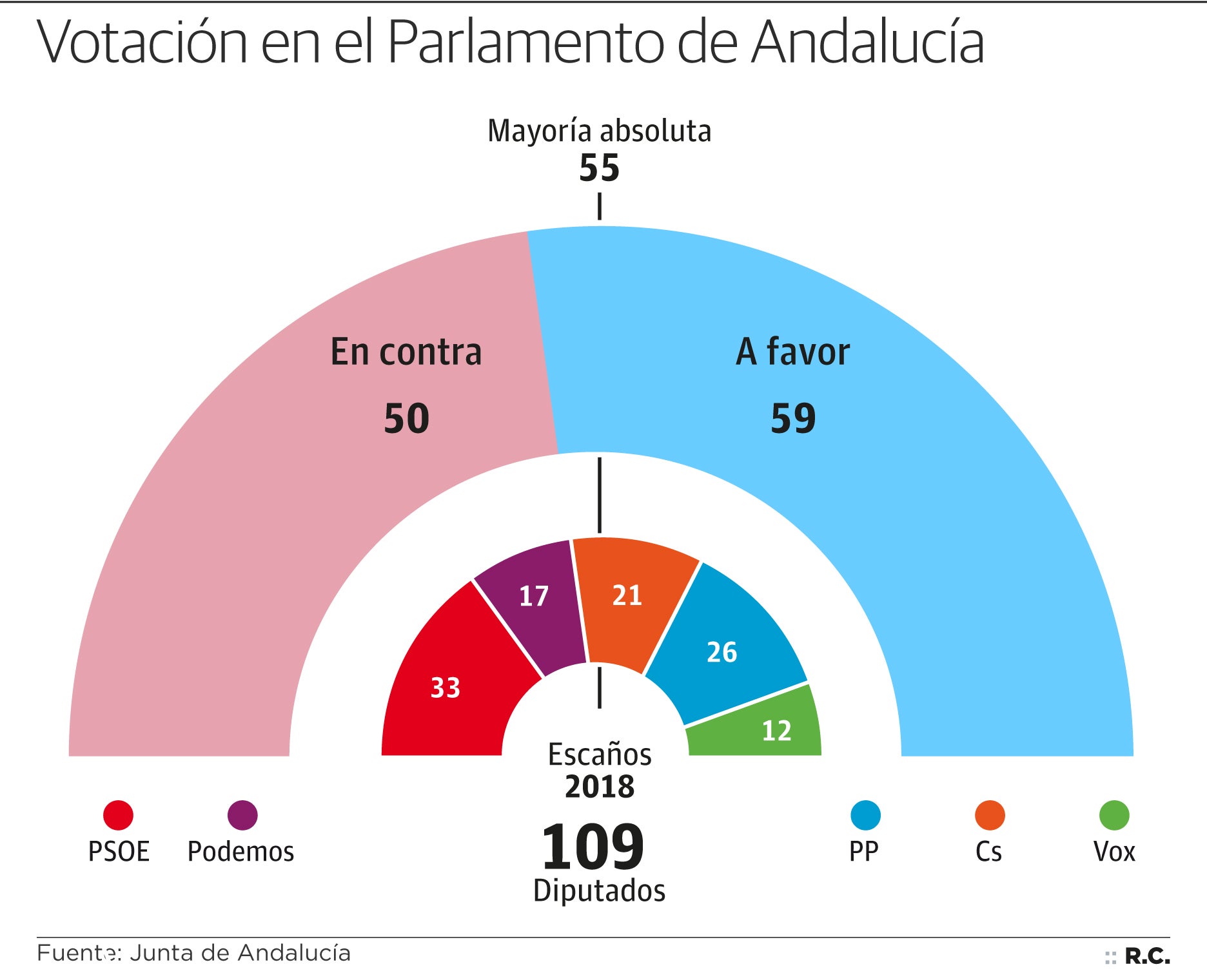 Cerca de las 18:00 horas, y tras ser elegido en primera votación con 59 votos a favor y 50 en contra, Moreno Bonilla abandonó el hemiciclo del Parlamento regional entre gritos de «presidente, presidente» y «Juanma, guapo», lágrimas de algunos militantes y palmas de otros, y un enjambre de cámaras al que deberá empezar a acostumbrarse. A trompicones, quiso tender la mano a la ya expresidenta, la socialista Susana Díaz, para iniciar una legislatura de «diálogo de verdad», asegurando que «será receptivo a cualquier propuesta que sea buena para Andalucía». Una vez su elección sea publicada en el Boletín Oficial y comunicada al Jefe del Estado, tomará posesión este viernes como nuevo presidente autonómico en una ceremonia que se prevé multitudinaria y a la que asistirán la nueva y la antigua cúpula del PP: Pablo Casado, Mariano Rajoy y Soraya Sáenz de Santamaría.