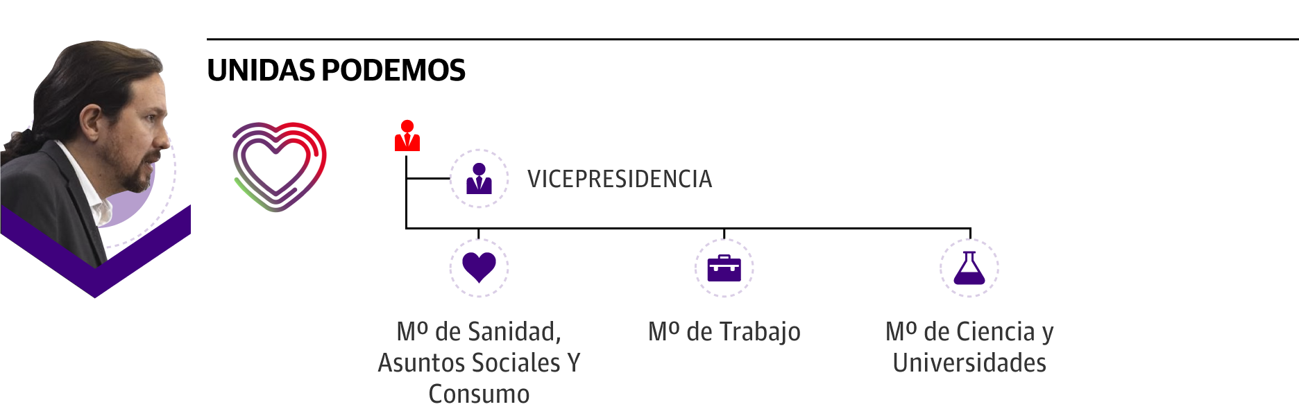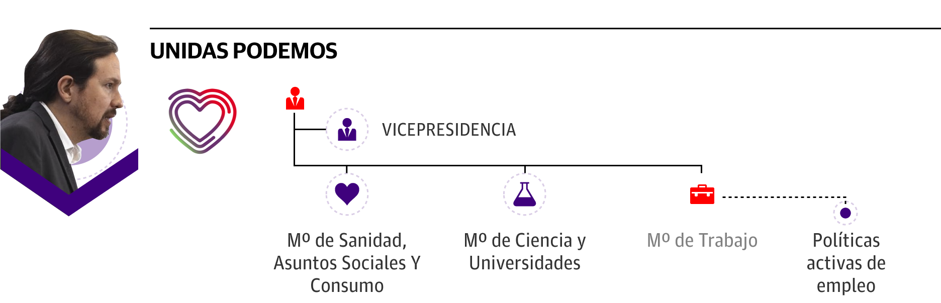 Los socialistas respondieron con una oferta en la que se mantenía una vicepresidencia y tres ministerios. Según se ha sabido en las últimas horas, la formación morada puso como condición obligatoria que desde el Gobierno en funciones se reconociera de forma pública que Irene Montero iba a ser la vicepresidenta. Esta última oferta suponía un cambio importante en la postura del PSOE, que pasó de asegurar que no aceptaba figuras de primer orden de Unidas Podemos en el Gabinete -como mucho en segundos rangos- a reconocer que llevarían una cartera. Al parecer, según las filtraciones más recientes, el escollo insalvable era Trabajo, área a la que aspiraba UP y que los socialistas no estaban dispuestos a ceder de ninguna de las maneras.