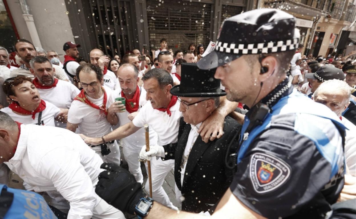 Tres agentes de la Policía Municipal de Pamplona resultaron este jueves heridos mientras protegían a la comitiva municipal que fue insultada y atacada por un grupo de radicales durante la procesión de San Fermín. Uno de los principales objetivos de los violentos era el alcalde de la ciudad, Enrique Maya, de Navarra Suma, la coalición de centro derecha formada por Unión del Pueblo Navarro, Partido Popular y Ciudadanos. El regidor denunció que «ha sido un acto que supera todos los límites, casi como un linchamiento» y señaló que los responsables son «del entorno de Bildu».
