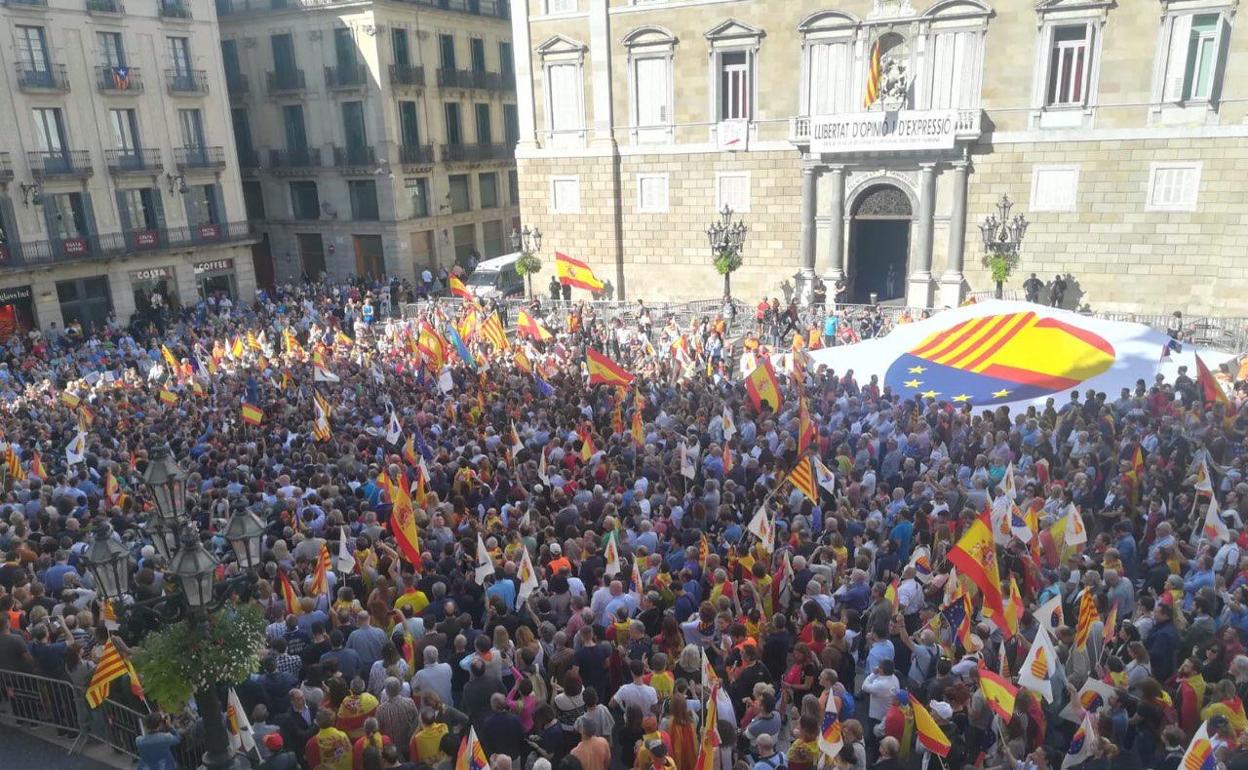 El candidato de Ciudadanos, Albert Rivera, ha visitado este domingo Barcelona después de seis días de disturbios y protestas continuadas en Cataluña desde la publicación el lunes pasado de la sentencia del 'procés'. Lo ha hecho rodeado de unas 1.700 personas -según la Guardia Urbana- congregadas en la plaza de San Jaume y que agitaban banderas de España, Senyeras y de la Unión Europea, mientras al fondo, en el edificio del Palau de la Generalitat, continuaba instalada la pancarta en la que se puede leer «libertad de opinión y de expresión».