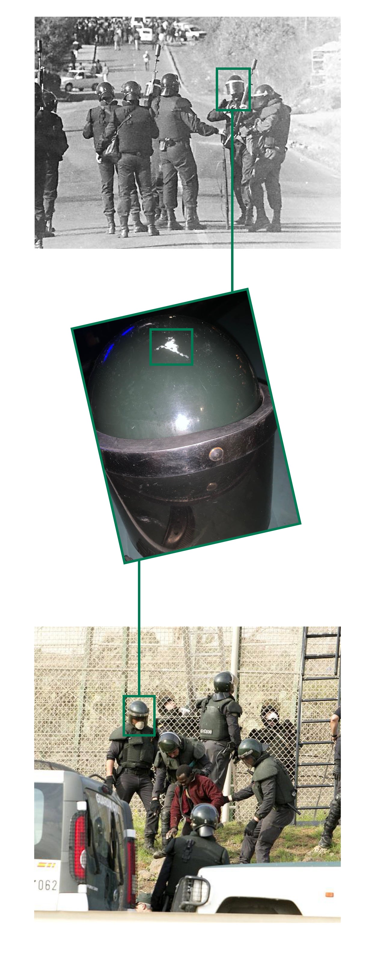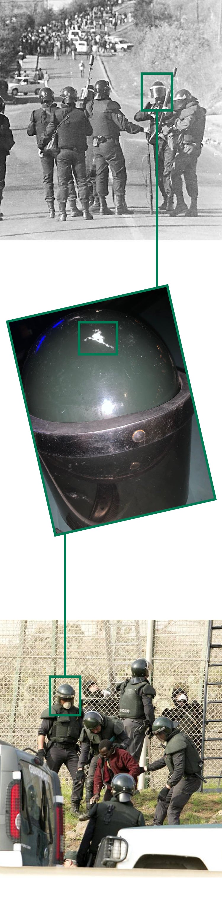 «No es que se trate del mismo modelo, es que son exactamente los mismos cascos que han pasado de mano en mano, mejor dicho de cabeza en cabeza, desde hace cuarenta años», aclara uno de los responsables del instituto armado en la ciudad. Con ese larguísimo historial de servicio no es de extrañar que uno de los agentes que intervenía en el famoso salto del pasado 24 de junio, que acabó con entre 23 y 72 inmigrantes muertos, se desplomara inconsciente cuando una pedrada rompió su casco.