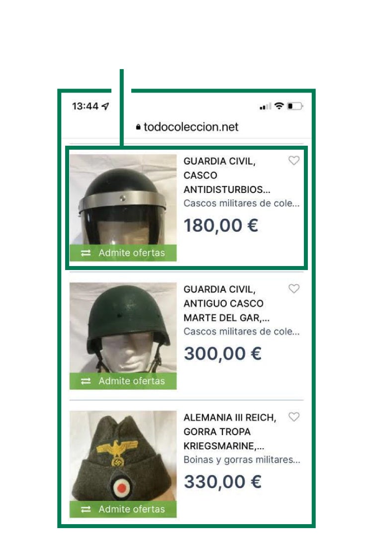 Se llama 'Todocolección.net' y es uno de los portales de referencia para los apasionados del material militar histórico. En esa web, junto a una gorra de la marina de guerra nazi (Kriegsmarine) o de un gorro de oficial médico del Tercer Reich, se oferta por 180 euros otra vetusta pieza de militaria: un casco verde de antidisturbios de la Guardia Civil de los que usaban los agentes del instituto armado en las algaradas de los ochenta en la reconversión industrial, minera o naval en diferentes puntos de España.