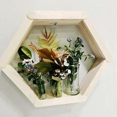 Una manualidad muy resultona y fácil para poder hacerla con los peques es una estantería hexagonal de madera. Son tendencia en decoración y el marco ideal para pequeñas ramas, hojas y flores.
