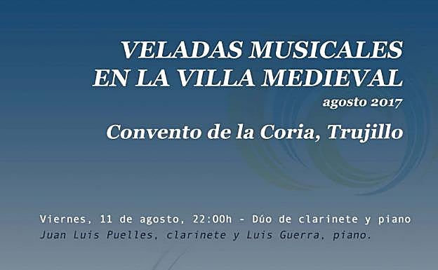 El convento de La Coria de Trujillo inaugura este viernes el ciclo de conciertos titulado ‘Veladas musicales en la villa Medieval’. El dueto formado por Juan Luis Puelles, al clarinete, y Luis Guerra, al piano, homenajeará la música latinoamericana, rica en tradiciones musicales. Un auténtico recorrido por las melodías cubanas, obras brasileñas y un toque colombiano del compositor Carlos Trujillo.